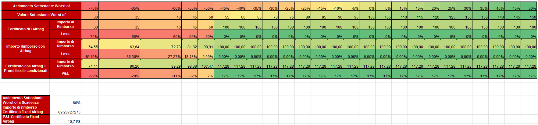 Ad esempio, se il titolo peggiore nel paniere perde a scadenza fino al 45% rispetto al suo valore iniziale, allora il certificato rimborsa comunque il suo valore nominale di 100 euro, più ovviamente l’ultimo premio previsto. Invece, in caso di ribassi del worst of superiori al 45% entrerà in gioco la protezione dell'Airbag che, come è possibile vedere chiaramente dalla tabella qui sotto, permette di attenuare di molto le perdite.