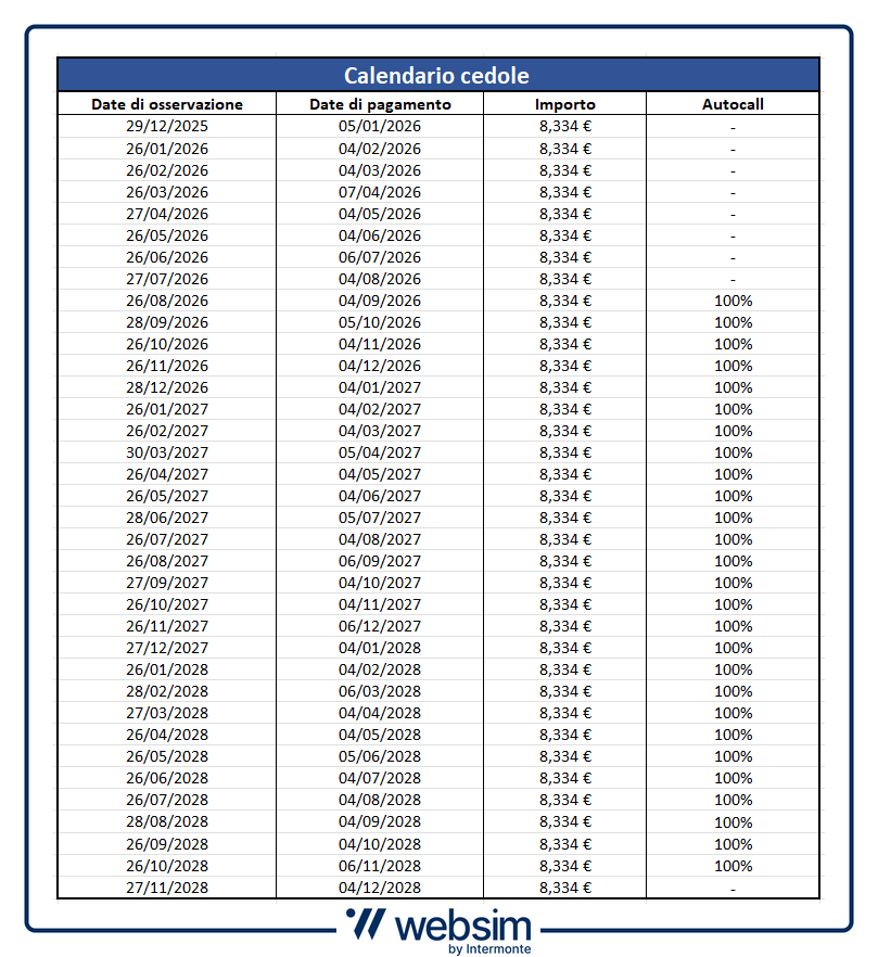 Il vantaggio? Anche se alcune cedole non vengono pagate durante la vita del certificato, basterà che all’ultima data di osservazione (novembre 2028) tutti i titoli siano sopra la barriera per incassare tutte le 36 cedole. Con un valore nominale di 1.000 euro, ogni cedola vale 8,334 euro, per un totale di 300 euro di flusso cedolare.