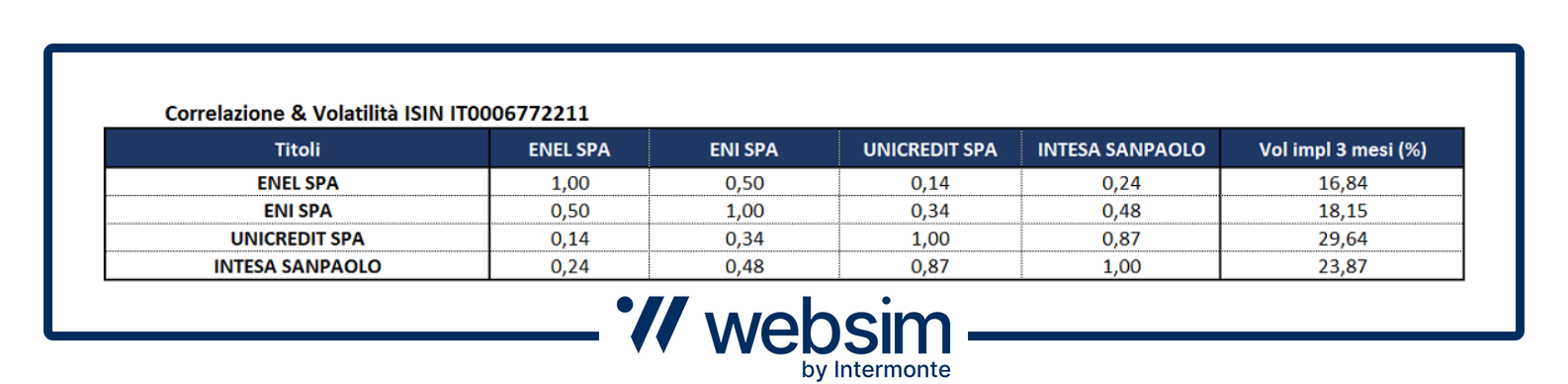 Uno dei punti di forza di questo certificato è la bassa volatilità implicita dei sottostanti: Enel (16,84%), Eni (18,15%) e Intesa Sanpaolo (23,87%) si collocano su livelli moderati, mentre UniCredit (29,64%) è leggermente più alta ma bilanciata dagli altri titoli. Questo significa minore rischio di oscillazioni estreme, elemento chiave per strategie di investimento orientate alla stabilità.