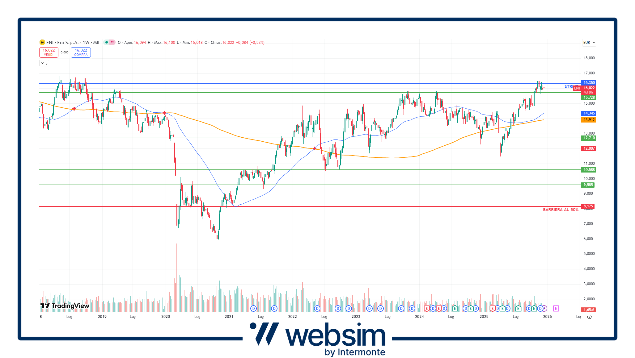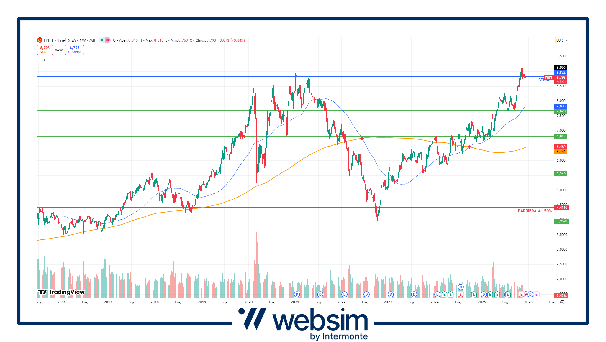 Enel conferma la sua leadership globale nelle rinnovabili e nella distribuzione elettrica, chiudendo i primi nove mesi del 2025 con ricavi in crescita a 59,7 miliardi (+3,6%) e utile netto ordinario a 5,7 miliardi (+4,5%). L’EBITDA ordinario si attesta a 17,3 miliardi, mentre il management ha deliberato un acconto sul dividendo di 0,23 euro per azione (+7%), in pagamento a gennaio 2026. Il Piano Strategico 2025-2027 prevede investimenti per 43 miliardi, focalizzati su reti resilienti e transizione energetica, anche in vista delle Olimpiadi Milano-Cortina 2026. Il titolo Enel si muove vicino ai suoi massimi dal 2021 mostrando un solido +27% da inizio anno.