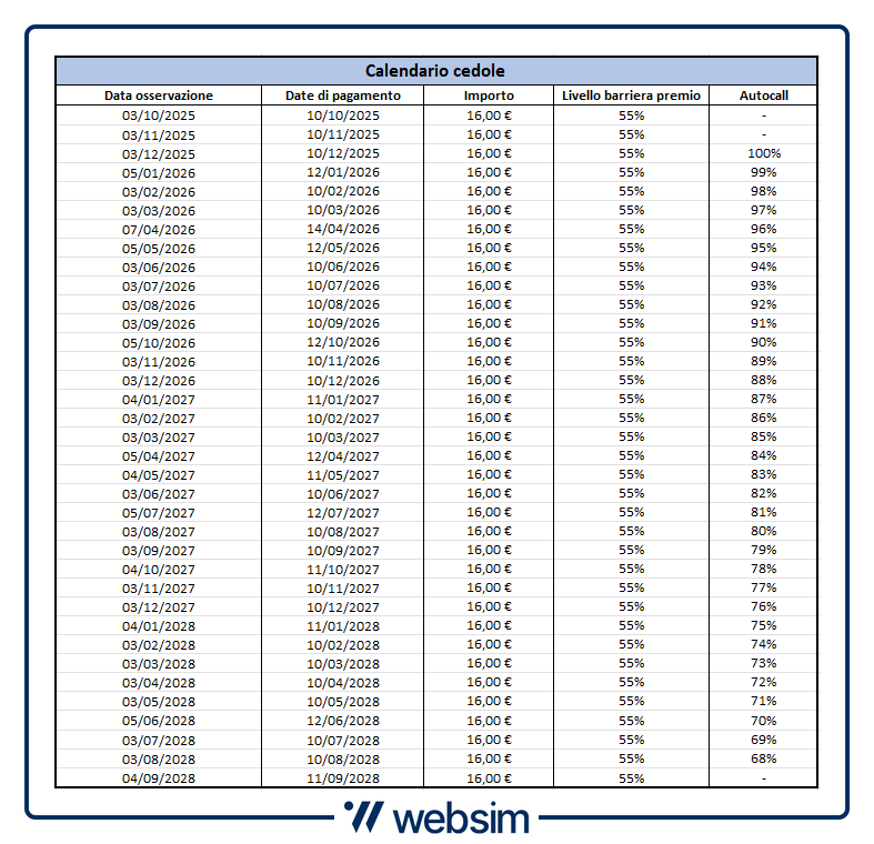 - Autocall “Fast”: da dicembre 2025, con step-down mensile di 1 punto percentuale dal 100% al 68% del livello iniziale, che facilita il richiamo anticipato (dicembre 100%, gennaio 99%, febbraio 98% … fino al 68%)