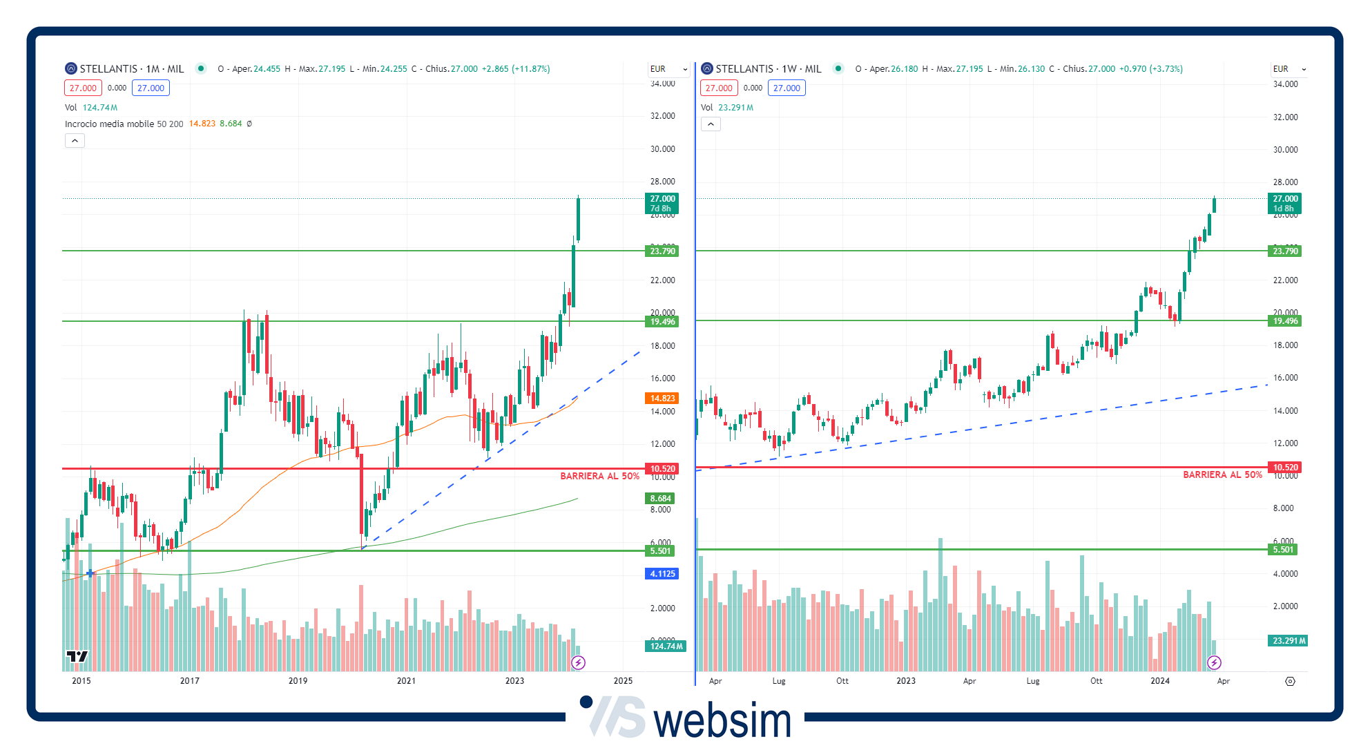 Il titolo si muove così sui massimi storici e con gli acquisti delle ultime settimane sembrerebbe essere diretto verso i 28 euro. Al contrario, in caso di prese di beneficio sarà da monitorare la tenuta delle principali aree di supporto, prima a quota 24€ e poi verso i 20€. Da notare che su Stellantis la barriera di protezione è posizionata a quota 10,523 euro, un livello molto distante dai prezzi attuali e che offre quindi all'investitore una certa sicurezza.