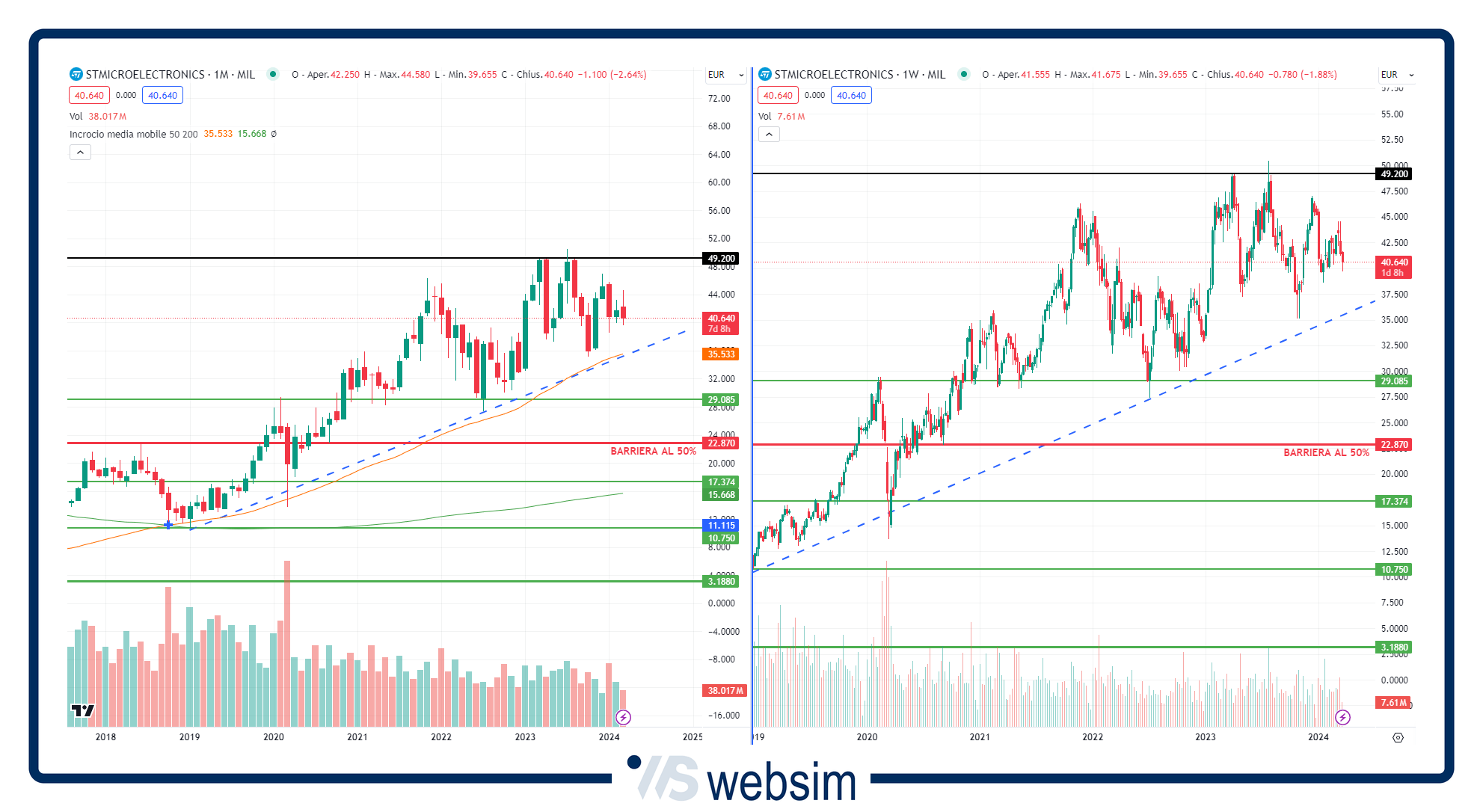 Buon andamento anche per l'ultimo titolo su cui punta il paniere (ISIN DE000VM64YM7): STMicroelectronics. Il titolo si è recentemente riportato al test della resistenza poco sotto a 50 euro, livello più alto dai primi anni 2000. Il titolo continua a restare nei radar degli investitori e dai minimi del 2016 mostra una performance di quasi l'800%.