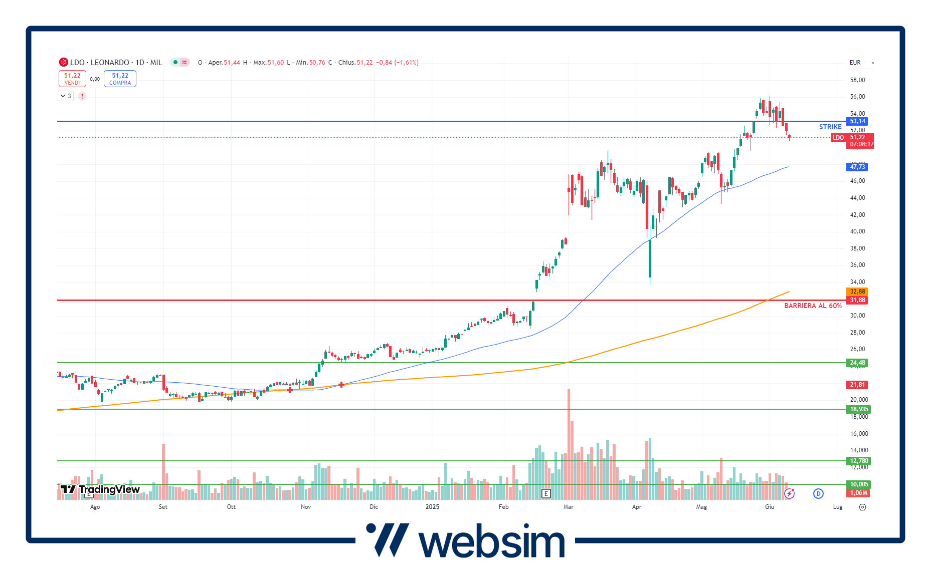 Leonardo ha fissato il suo prezzo inziale a quota 53 euro, con la sua barriera a scadenza al 60% che si va dunque a collocare a 31,8 euro. Un livello che, come vediamo dal grafico giornaliero del titolo, si trova sotto i minimi di aprile di quest'anno dopo l'annuncio dei dazi dell'amministrazione americana guidata da Trump.