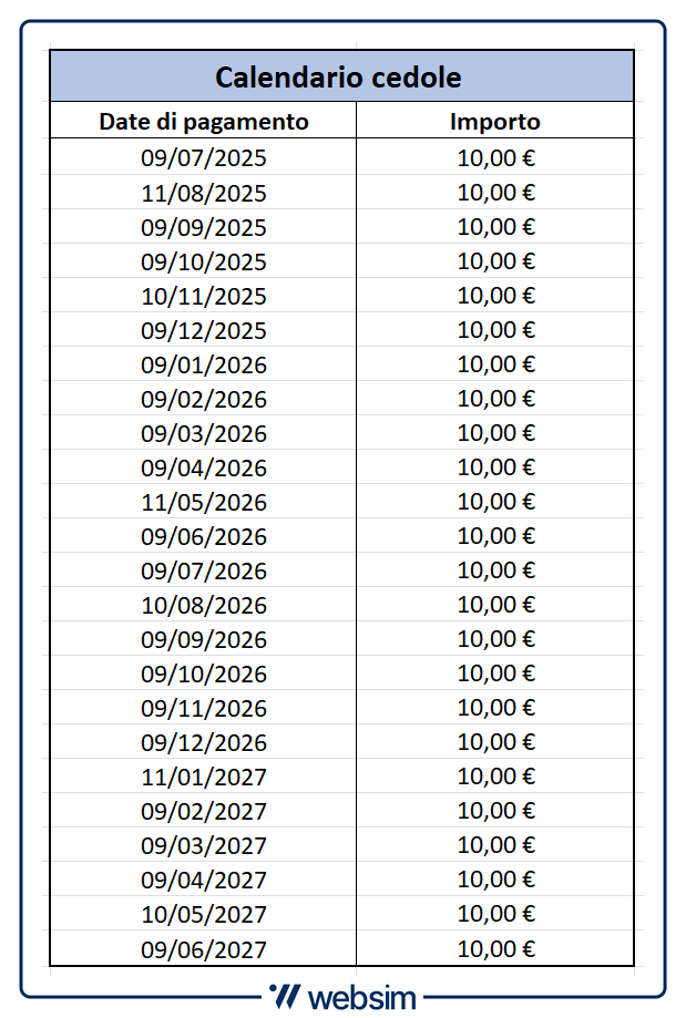 Come vediamo dalla tabella riportata qui sotto, la data in cui sarà pagata la prima cedola incondizionata è prevista per il 9 luglio 2025, mentre l'ultima è in programma per giugno 2027.