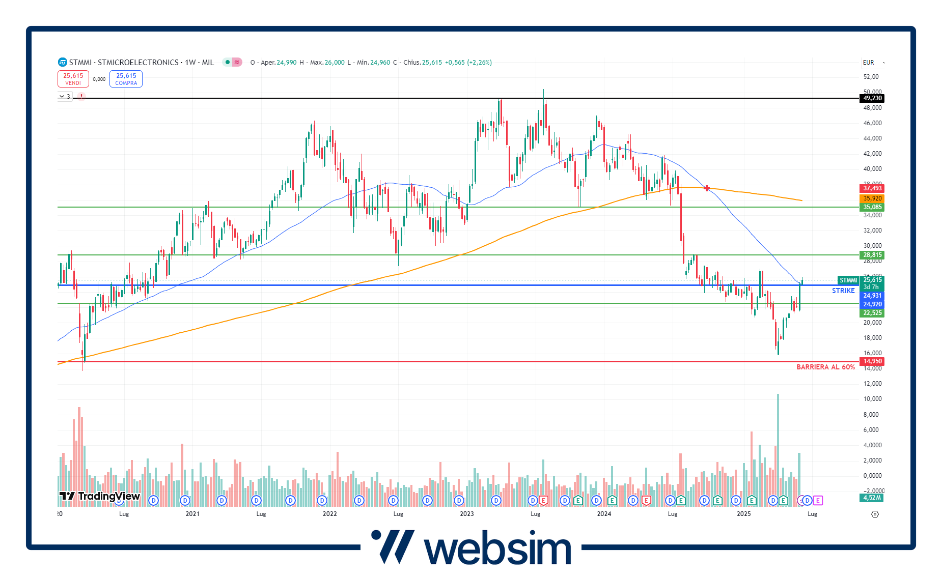 Nel caso del certificato ISIN CH1453354347, STM ha fissato il suo prezzo di riferimento iniziale a quota 24,9 euro (linea blu sul grafico settimanale qui sotto), con la barriera al 60% sul titolo che si trova così poco sotto i 15 euro ad azione, livello sotto i minimi di quest'anno segnati a 15,76 euro.