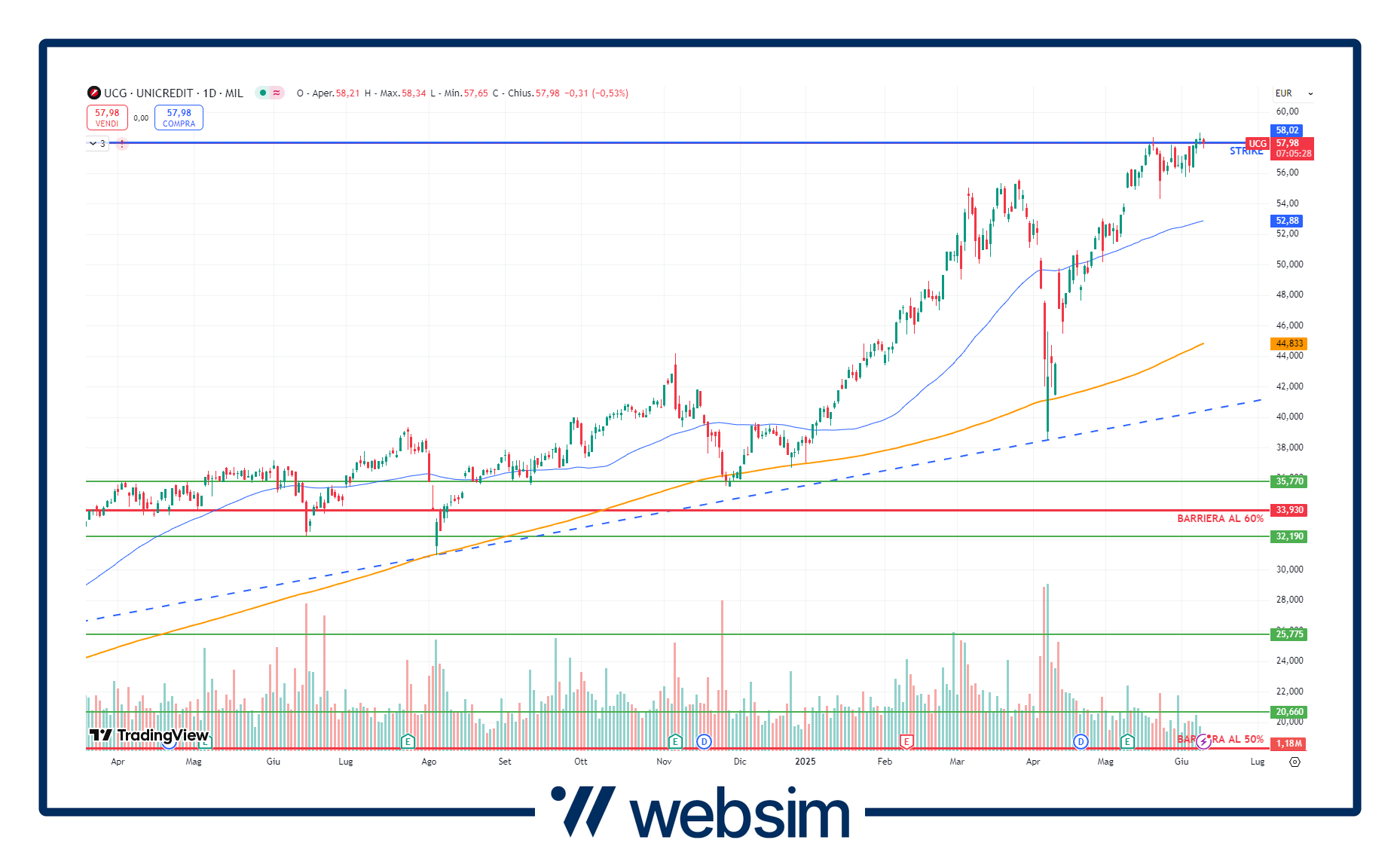 UniCredit ha fissato il suo prezzo strike a 56,5 euro, con la barriera al 60% che si va dunque a posizionare sotto i 34 euro. Area di prezzo che come vediamo dal grafico qui sotto su time frame giornaliero si trova sotto le principali medie mobili a 50 e 200 periodi, ma anche al di sotto di importati aree supportive statiche e dinamiche.