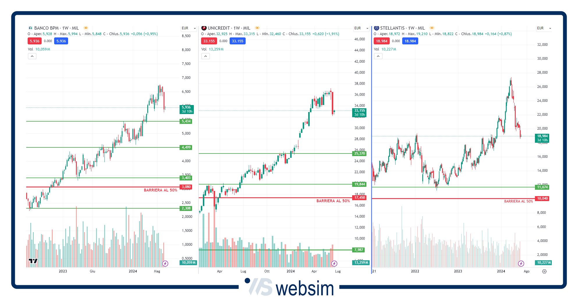 Nel grafico sottostante possiamo vedere l'andamento su time frame settimanale dei tre titoli del nuovo basket di Leonteq. Come vediamo sono ben posizionati i rispettivi livelli barriera dato che si trovano al di sotto di importanti aree supportive. Per Banco BPM le principali aree di supporto che potrebbero sorreggere e respingere al rialzo i prezzi si trovano prima a quota 5,43 euro e poi più in basso verso i 4,5 euro e i 3,4 euro. Tutti livelli al di sopra della barriera a scadenza al 50% che in questo caso è a quota 3,08 euro.