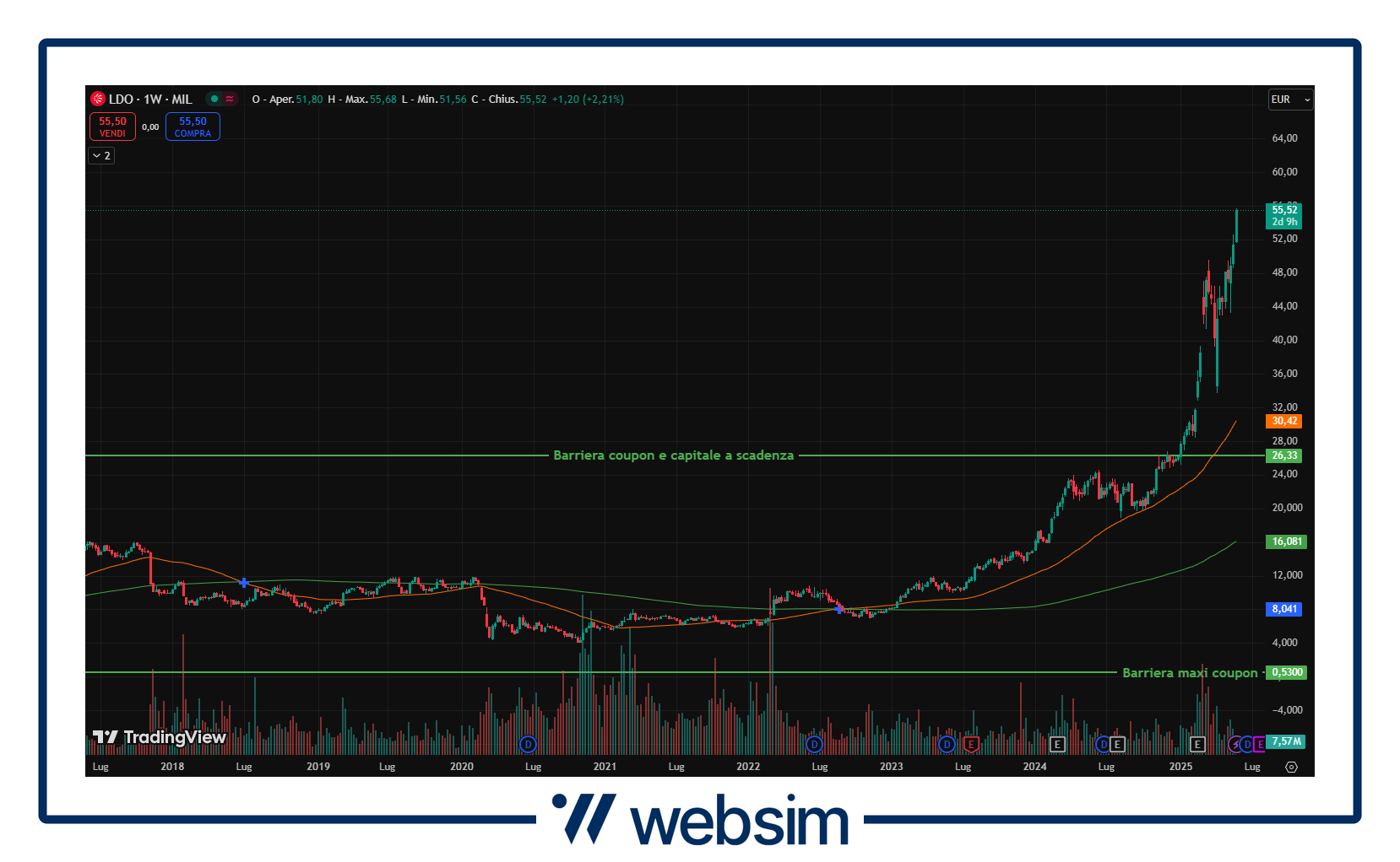 Il leader dell’aerospazio italiano prosegue la sua crescita sostenuta, alimentata dalle persistenti tensioni geopolitiche in Ucraina e Medio Oriente. Le previsioni restano ottimistiche, grazie alla posizione di rilievo che l’azienda ricopre in numerosi settori strategici della difesa, rendendola ben posizionata per beneficiare dell’aumento degli investimenti globali in sicurezza. Parallelamente, Leonardo accelera il proprio percorso di evoluzione, puntando su alleanze strategiche di rilievo e sull’adozione di tecnologie d’avanguardia come il calcolo ad alte prestazioni, il cloud computing e l’intelligenza artificiale. Un percorso che sta gradualmente portando a una trasformazione del modello di business, con un peso sempre maggiore dell’innovazione tecnologica rispetto all’attività manifatturiera tradizionale. Il titolo quota attualmente in area 55,58 EUR con le due barriere previste a 26,33 EUR (coupon e capitale a scadenza) e 0,53 EUR (maxi coupon iniziale).