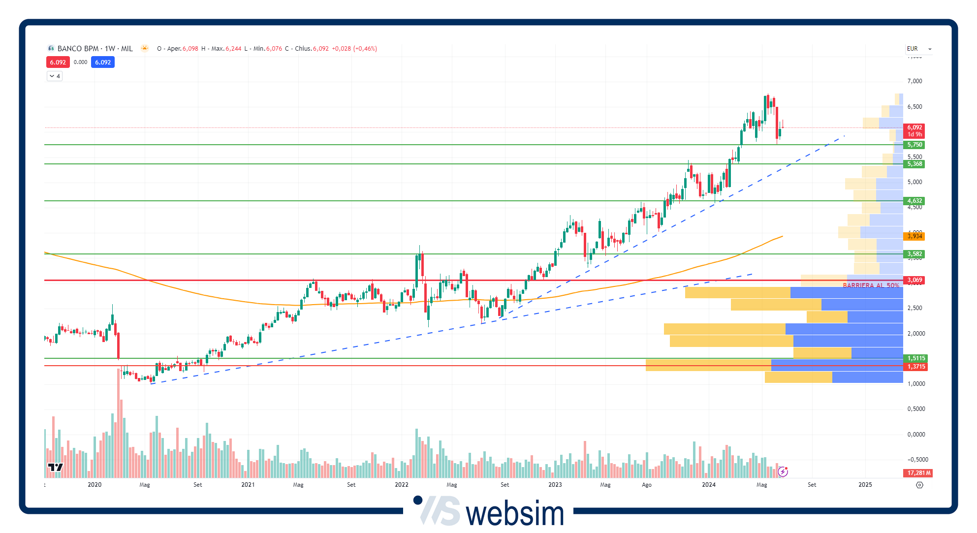 Nonostante le prese di profitto viste nella settimana del 10 giugno, ottava in cui il Banco perse circa il 10%, il trend di fondo sul titolo rimane favorevole e con buone prospettive. Teniamo presente che con la cavalvcata dell'ultimo anno e mezzo si è riportato sui livelli di prezzo che non rivedeva dal 2016. Da inizio anno si trova tra i top gainers di Piazza Affari con un progresso del 26%, +50% nell'ultimo anno, not bad!
