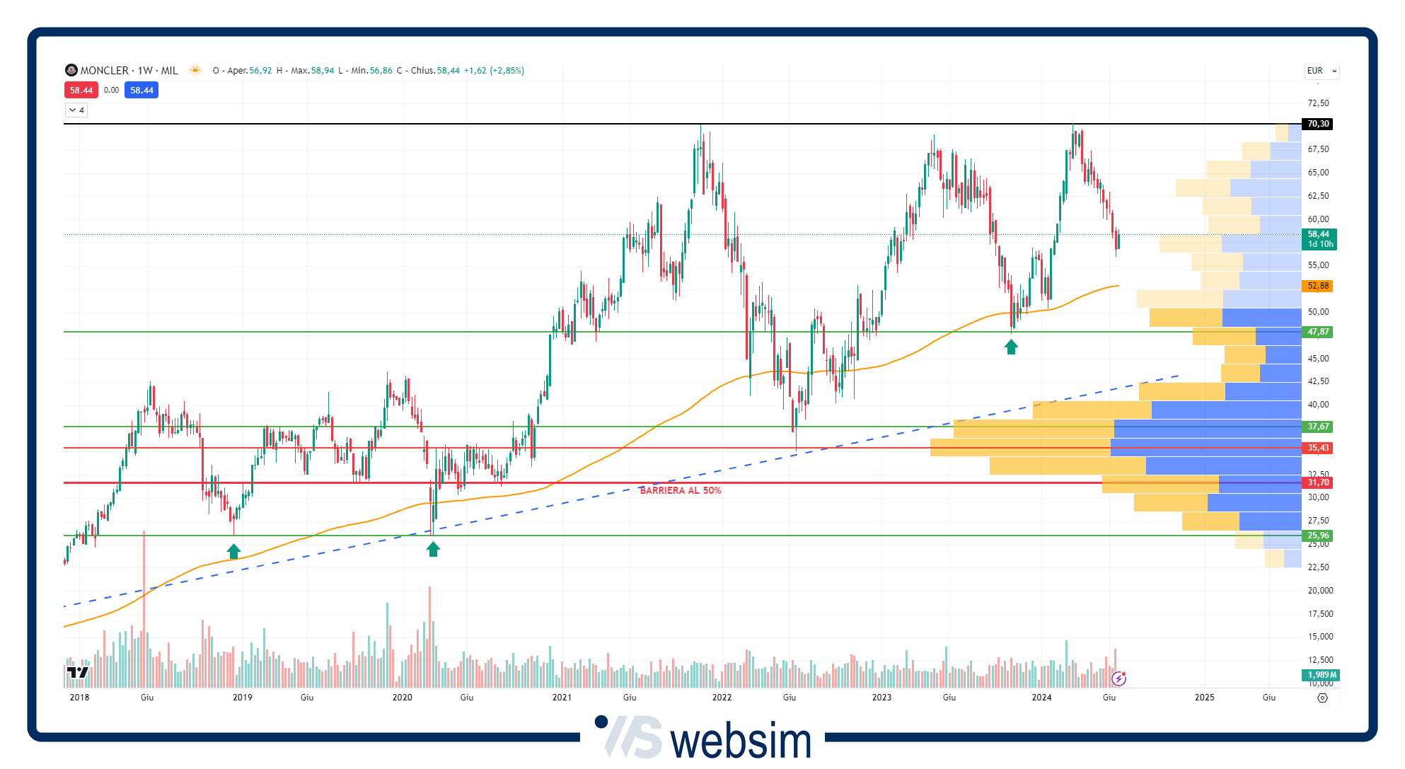 Partiamo con l'analisi del titolo worst of del basket, Moncler. Il titolo non è riuscito a superare l'area di resistenza a quota 70 euro ad azione, livello evidenziato nel grafico su time frame settimanale (qui sotto) dalla linea orizzontale nera, e da li ha ritracciato tornando così sui livelli di settembre dello scorso anno. Nonostante mostri un +4,9% da inizio anno, se andiamo ad allargare lo sguardo all'ultimo anno di negoziazione vediamo come la sua performance sia negativa del 6,5%. Ora le prossime aree di prezzo che potrebbero sostenere i prezzi e innescare un rimbalzo tecnico si trovano prima nei pressi della media mobile a 200 periodi che transita a 52 euro e poi più in basso verso i 47 euro e i 37 euro ad azione. Ecco che sono queste le principali aree di prezzo rilevanti che separano Moncler dal suo livello barriera a 31,7 euro, un'area di prezzo che si trova anche al di sotto del POC (Point of Control del volume profile) nel periodo preso in esame.