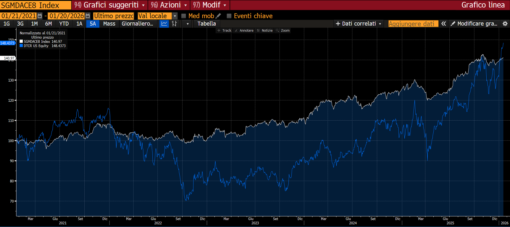 L'indice integra un meccanismo di controllo della volatilità che, almeno sulla base dei dati storici, si è rivelato particolarmente vincente per questo settore.. Lo si vede bene dal confronto diretto con l’ETF Global X Data Center & Digital Infrastructure. Infatti, l’ETF a 5 anni ha segnato una performance del 59% circa, con una performance annualizzata di poco più del 9,8%. Di contro, l’indice di Societe Generale ha segnato una crescita nello stesso periodo del 49%, pari ad una crescita annualizzata del 8,2%. Considerata la protezione totale del capitale a scadenza e la possibilità di generare redditi diversi dall'eventuale capital gain, il certificato rappresenta una soluzione particolarmente interessante per chi vuole esporsi al settore tecnologico dei data center senza subire l'elevata volatilità tipica di questo segmento. Il grafico sottostante, che confronta l'ETF Global X (linea blu) con l'indice SGI Data Center VT 8, evidenzia chiaramente questo aspetto: l'ETF sovraperforma ma con una volatilità nettamente maggiore. L’indice SGI Data Center VT 8 ha un trend di crescita costante ed è molto più efficiente. Perché?