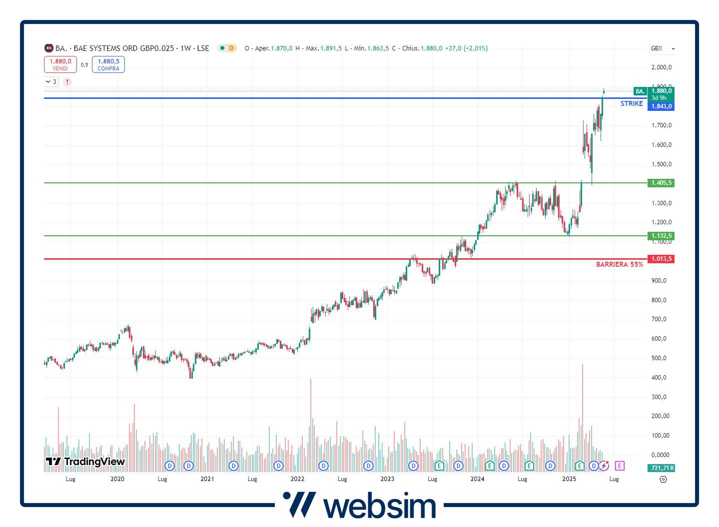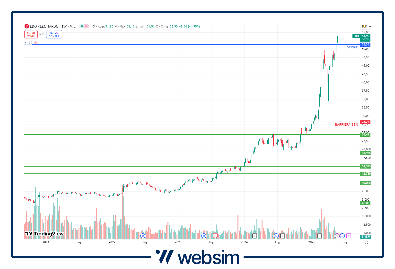 Come dicevamo, il certificato di oggi punta sul paniere worst-of composto dai quattro titoli della difesa europea. Stiamo infatti parlando dell'italiana Leonardo, della tedesca Rheinmetall, dell'inglese BAE Systems e della francese Dassault Systèmes. Andiamo ad analizzarli e a vedere sui grafici delle quotazioni dove si va a collocare il prezzo strike e la relative barriere di protezione al 55%.