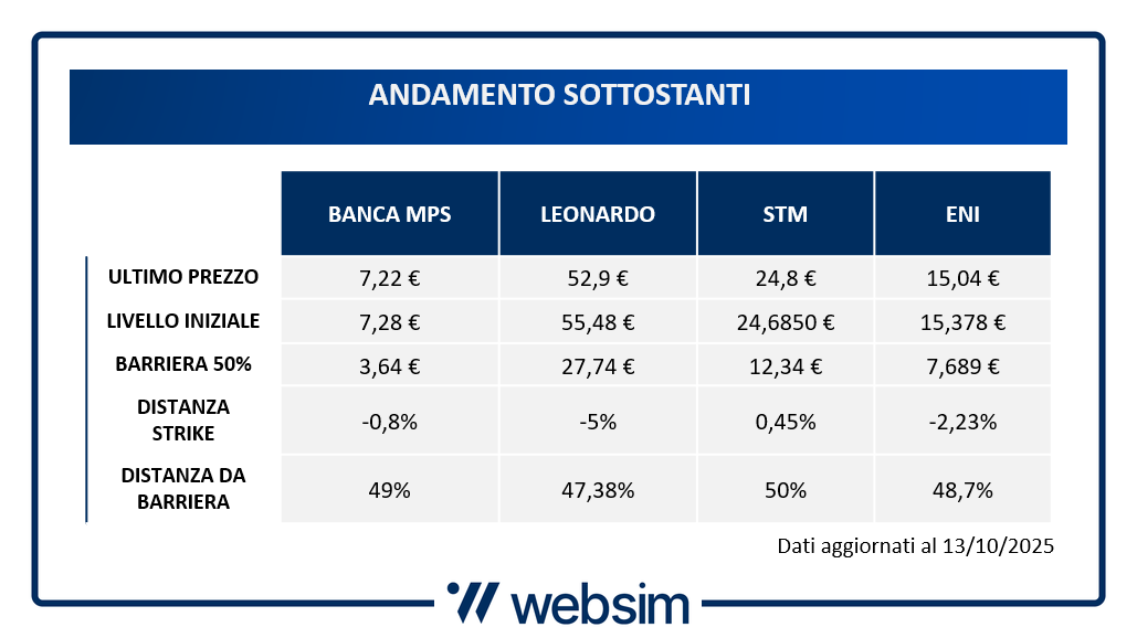- Sottostanti: Banca MPS – Leonardo – STM – Eni