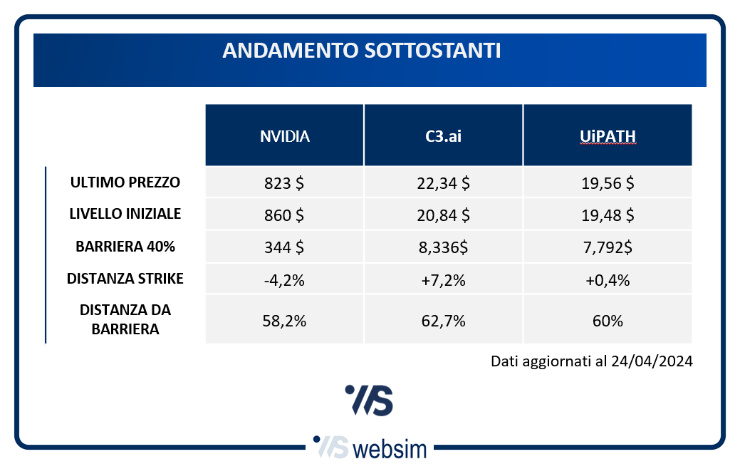 I sottostanti sono Nvidia e due società americane di minori dimensioni ma comunque molto attive nel campo dell'intelligenza artificiale, C3.AI e UiPath. Queste ultime operano infatti nello sviluppo di applicazioni di AI per le imprese ed entrambe hanno buone prospettive di crescita.