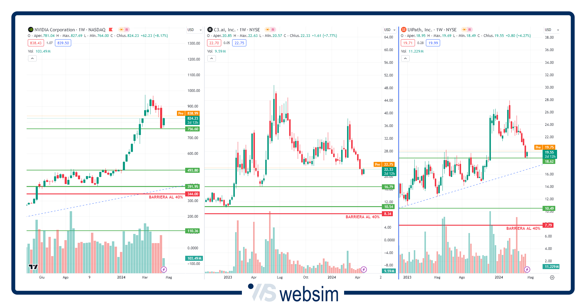 Nei tre grafici qui sotto vediamo l'andamento su time frame settimanale dei tre titoli del paniere. Come vediamo, su tutte e tre le società, i livelli barriera al 40% risultano essere strategici dato che si trovano al di sotto di importanti aree supportive.