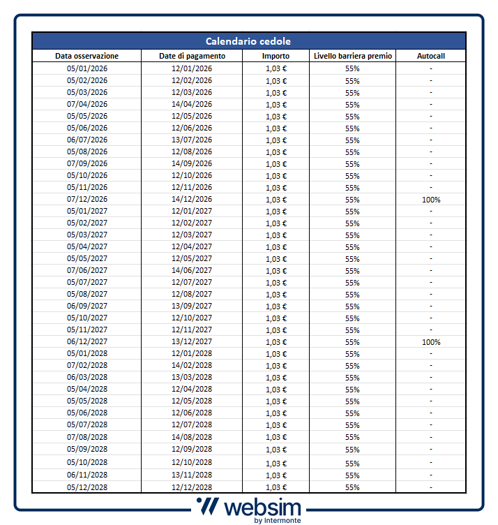 Il certificato offre cedole mensili con memoria pari all’1,03%, ovvero 12,36% all’anno.