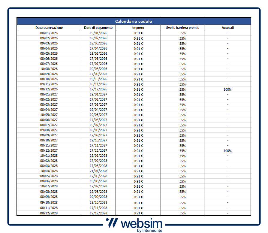 Se l’autocall dovesse scattare fra un anno, nel dicembre 2026, chi compra oggi il prodotto andrebbe a chiudere l’investimento con l’incasso di 32,76 euro di cedole in soli 12 mesi (rendimento annuo del 32,7%).
