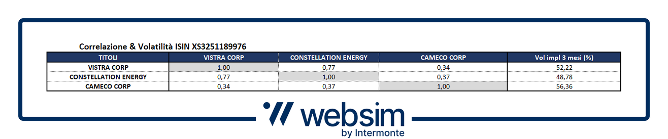 - Se il titolo peggiore del paniere composto da Cameco, Constellation Energy e Vistra Corp quoterà a un livello pari o superiore alla barriera a scadenza al 50% del valore iniziale, il certificato rimborserà il valore nominale e pagherà l'ultima cedole più quelle eventualmente non incassate in precedenza (effetto memoria).