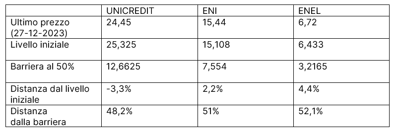 Passato un mese dalla sua emissione, il certificate è scambiato sul mercato secondario a un prezzo molto vicino al valore nominale (100,5 euro). Nel frattempo, sia Eni che Enel si sono mossi al rialzo rispetto ai Valori iniziali, mentre Unicredit ha perso leggermente terreno per il timore che una discesa dei tassi di interesse vada a ridurre la redditività delle banche.