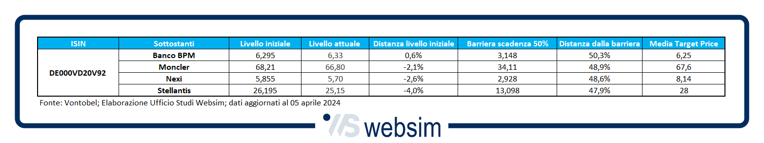 Occhi puntati sul nuovo Fast Cash Collect di Vontobel (ISIN DE000VD20V92) su Banco BPM, Moncler, Stellantis e Nexi. Premi mensili dell’1,15% e barriere al 50%. Autocall da giugno e durata 30 mesi.