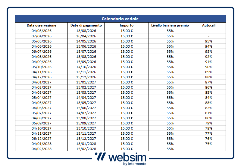 Il prodotto paga cedole mensili con memoria dell'1,50% (18% annuo) e presenta la stessa struttura del precedente: barriera al 55%, durata due anni e Autocall decrescente dell’1% mensile, dal 95% al 75% a partire da maggio 2026.