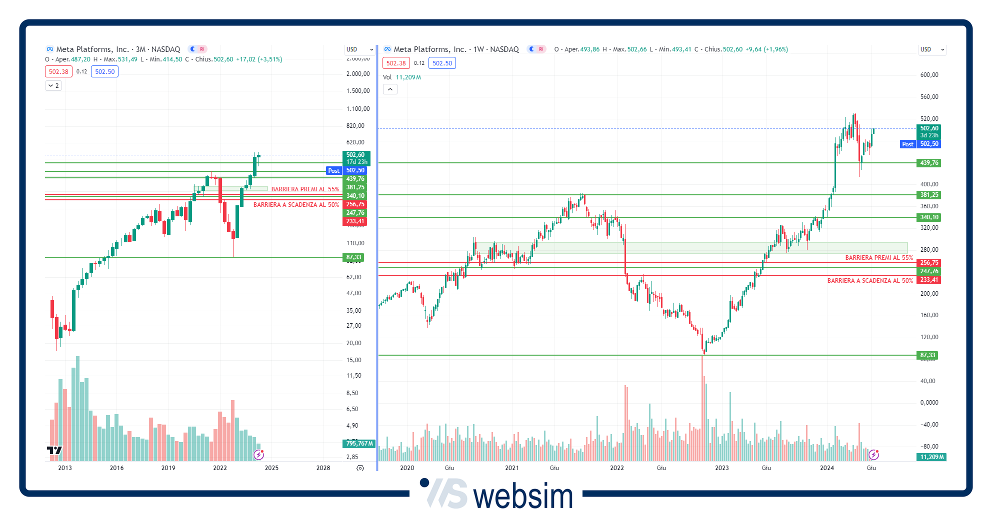 Tendenza positiva anche per il colosso tecnologico guidato da Zuckerberg che con un progresso del 43% da inizio anno si è riportato sopra i massimi del 2021. Al momento, la principale area supportiva per il titolo si trova a 440$ e poi in basso verso i 380$ e poi ancora verso i 340$. Tutti livelli che si trovano notevolmente al di sopra delle aree barriera premi e capitale previste per il titolo dato che si trovano rispettivamente a 256$ e 233$ ad azione.