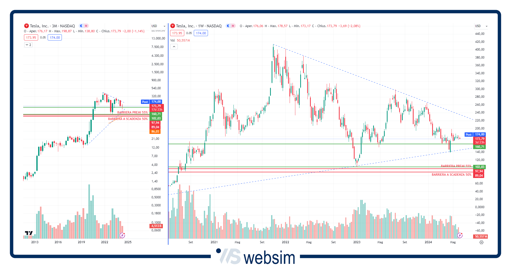 Partiamo con l'analisi di Tesla, titolo che negli ultimi due anni è rimasto più indietro rispetto ad altri colossi tecnologici. Nei grafici qui sotto vediamo, a sinistra l'andamento su time frame trimestrale (e scala logaritmica) di Tesla, mentre sulla destra vediamo il suo andamento settimanale. Come vediamo il colosso delle auto EV guidato da Musk da inizio aprile ha trovato supporto in area 160$. Ora la principale area di resistenza si trova in area 200$ e un suo deciso breakout al rialzo potrebbe favorire un allungo dei prezzi verso i 220$, livello da cui transita anche la trendline ribassista costruita dai massimi storici di fine 2021, prima che il titolo invertisse la rotta. In ogni caso siamo ancora molto distanti dai livelli barriera, posizionati sotto i 100$, livello che rappresenta la più importate area supportiva per il titolo.