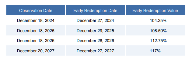Il prodotto prevede anche la possibilità di rimborso anticipato discrezionale (callability). Cosa significa? Che Goldman Sachs potrà richiamare anticipatamente il prodotto ogni anno fino al quarto anno compreso. Dovrà però pagare un premio del 4,25% cumulabile. Nella tabella sotto questo è ben illustrato. Quindi il primo anno il certificato rimborserebbe, se richiamato, 1.042,5 euro, il secondo anno 1.085 euro, il terzo anno 1.127,5 euro e l’ultimo anno 1.170 euro.