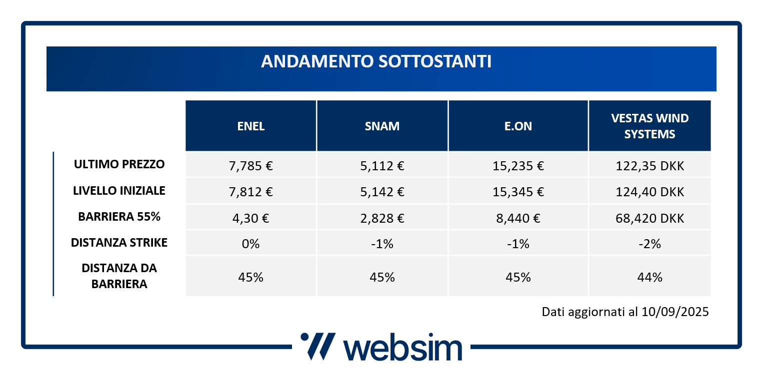 I sottostanti del Cash Collect ISIN IT0006769969 sono quattro giganti del settore energetico: Enel, Snam, E.On e Vestas Wind Systems. La scelta non è casuale: