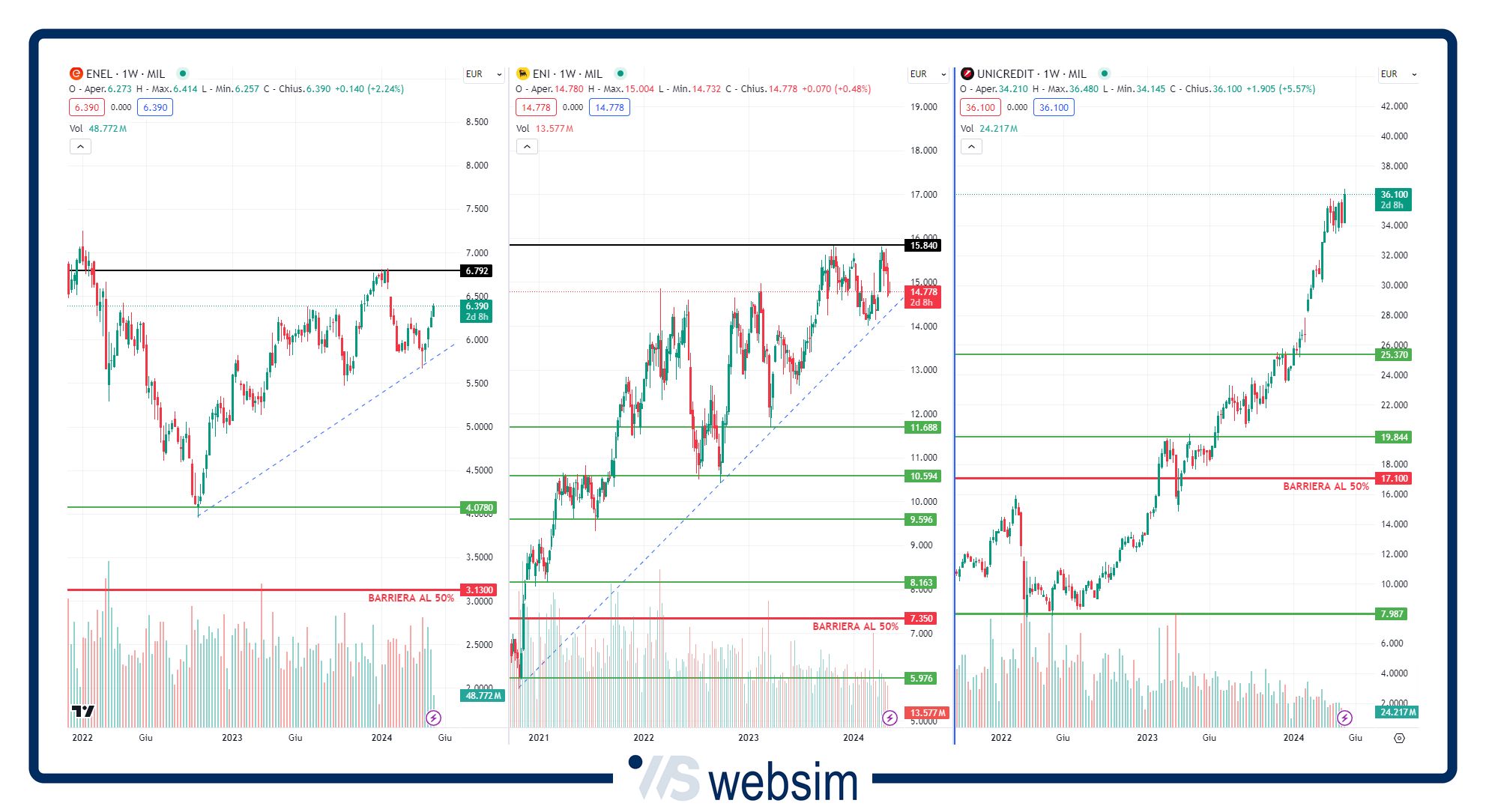 Prima di andare ad analizzare tutte le caratteristiche dello strumento di oggi, visto l’attuale contesto di mercato, ci sembra opportuno andare ad analizzare i tre titoli del paniere che si presenta ben diversificato dato che punta sui big di tre differenti settori: una banca (Unicredit), un petrolifero (Eni) e un'utility (Enel).
