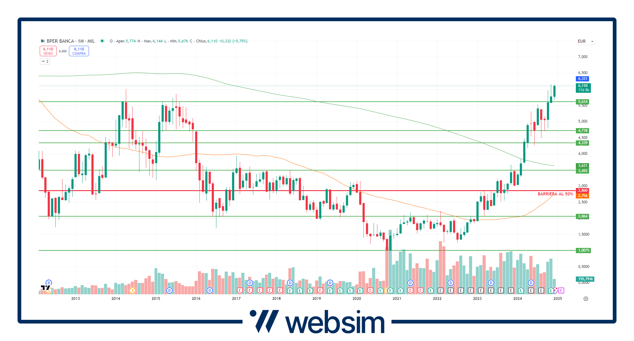 BPER Banca ha chiuso il penultimo trimestre dell'anno con risultati migliori delle attese. Nonostante l'ultimo trimestre del 2024 sia atteso come meno profittevole rispetto i precedenti, anche a causa di un aumento stagionale dei costi, BPER resta sul percorso giusto per poter garantire una politica di payout più ricca e allineata a quella delle competitor dirette del Ftse Mib, con un target di assestamento nell’area del 75% payout ratio. Il titolo scambia attualmente in area 6 €, sui livelli massimi dal 2010. Da inizio anno il colosso bancario di Modena ha raddoppiato la sua quotazione, con i principali livelli di supporto che, come vediamo dal grafico di lungo periodo qui sotto, si trovano a 5,6 euro - 4,7 euro e poi verso i 3,6 euro. Tutti livelli supportivi che in caso di inversione della tendenza di Bper potrebbero respingere i prezzi salvaguardando così la barriera a quota 2,86 euro (prezzi di settembre 2023).