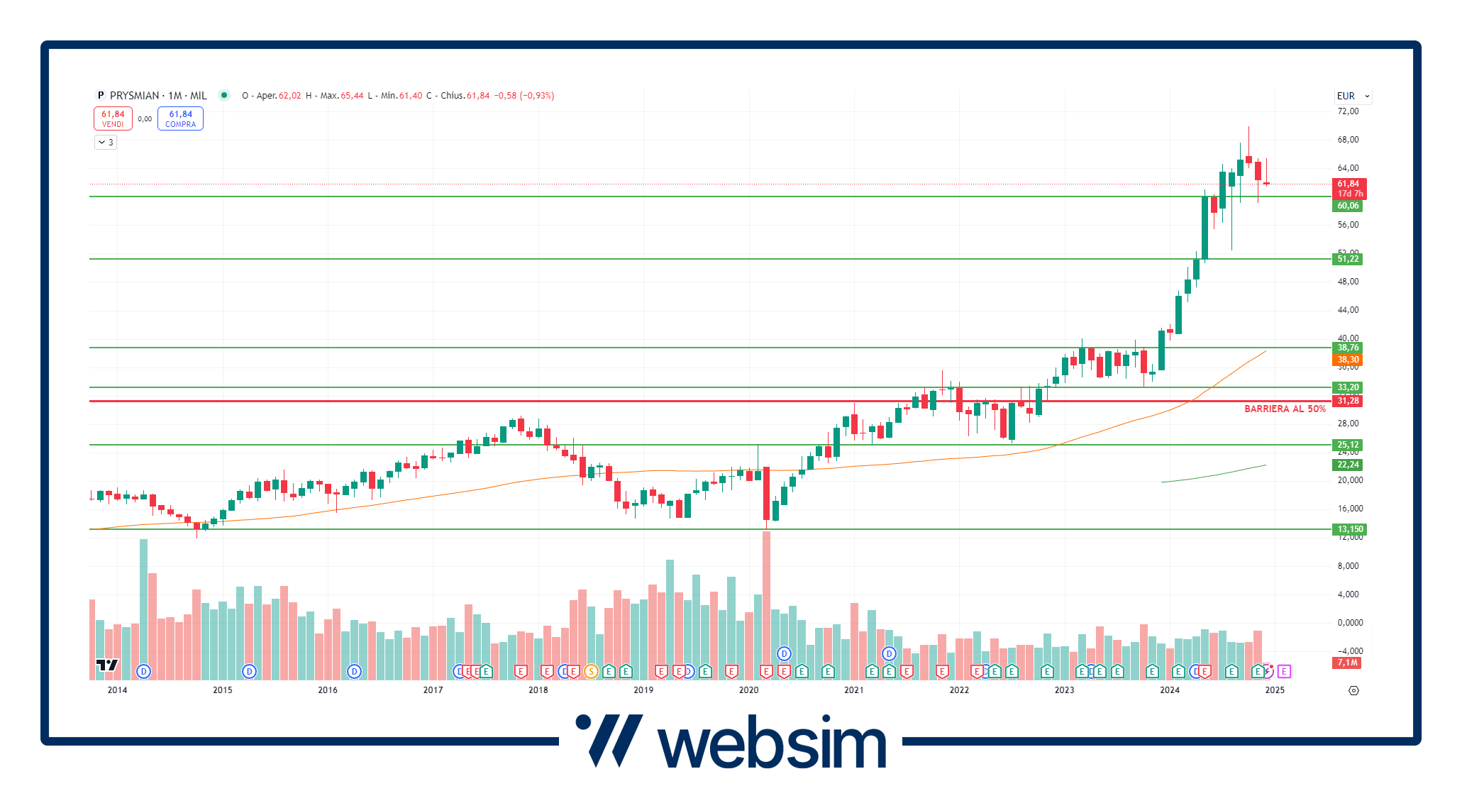 Ottime performance anche per l'ultimo titolo del certificato ISIN DE000UG0VWH2, Prysmian. Il colosso italiano nel settore dei cavi e dei sistemi per energia e telecomunicazioni, mostra una chiara tendenza rialzista di lungo periodo e da inizio anno evidenzia un progresso del +50%. Il titolo scambia attualmente in area 61,8 €, sostenuto da due importanti supporti visti in area 60 €. La barriera al 50% sul titolo, come vediamo dal grafico sotto su time frame mensile, è a quota 31 euro, prezzi mai più raggiunti da ottobre 2022. Oltre all'area dei 60 euro, le principali aree di supporto si trovano a 51 euro e poi verso i 38 euro, prezzo da cui transita anche la media mobile di lungo periodo. Consensus degli analisti anche in questo caso positivo visto che quasi la totalità di essi rimane in posizione long sul titolo. Il prezzo obiettivo a 12 mesi è in area 70 euro, il che implica un ulteriore upside del 13% dai livelli attuali a Piazza Affari.