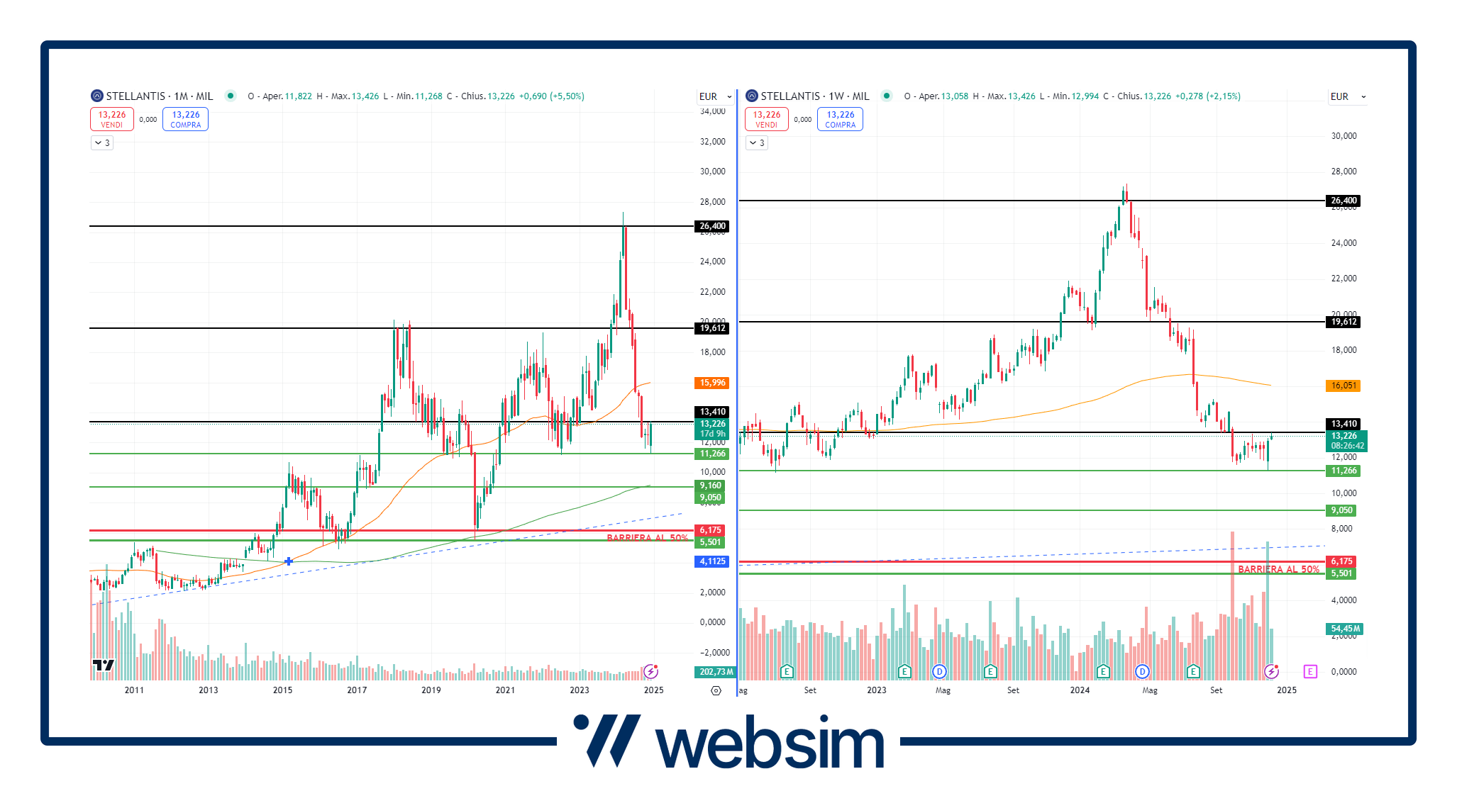 Come vediamo dal grafico (a sinistra time frame mensile, a destra time frame settimanale), le principali aree di supporto per Stellantis sono prima a 11,2 euro (livello che ha respinto al rialzo i prezzi anche di recente) e poi verso i 9 euro ad azione.