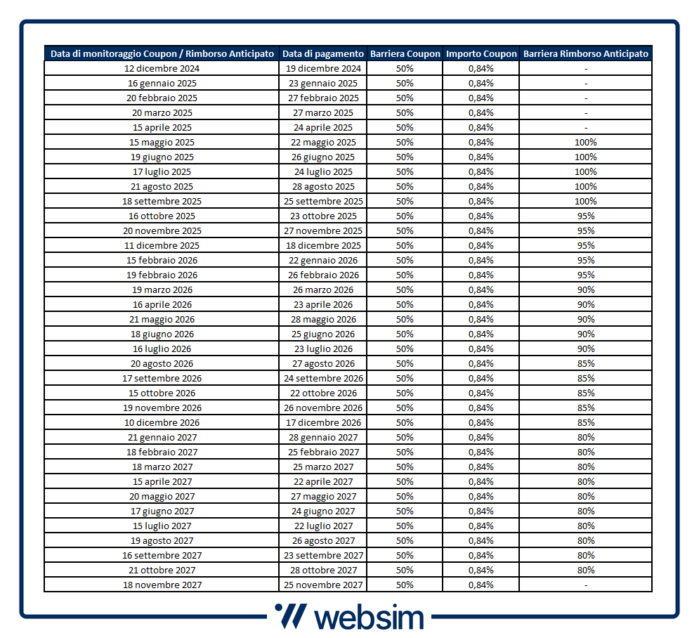La scadenza naturale del certificato è prevista per novembre 2027, ma potrebbe anche non arrivare a tale data visto che a partire da maggio 2025 potrà essere rimborsato anticipatamente con il meccanismo dell'Autocall con un trigger decrescente dal 100% all'80% degli strike.