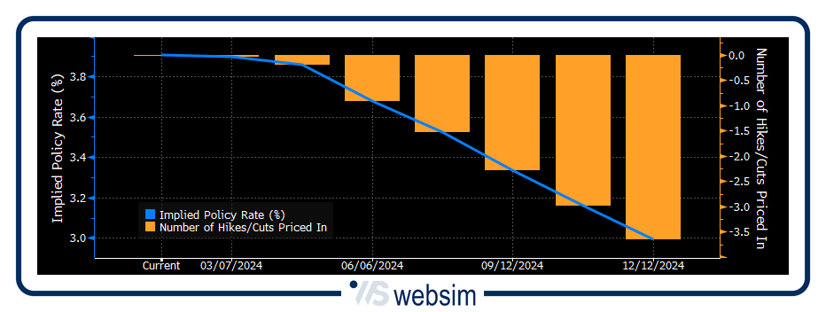 Allungando però l’orizzonte temporale le cose cambiano sensibilmente, con le aspettative del mercato, che a fine anno vedono dei tagli al costo del denaro, dopo due anni di aumento. Entrando più nello specifico, in Europa al momento il tasso sui depositi (facility rate) si trova al 4%, con le attese che stimano da qui a fine anno tre tagli dei tassi da 25 punti base l’uno (a partire dall’estate) che dovrebbero così portare il tasso intorno al 3,25%.