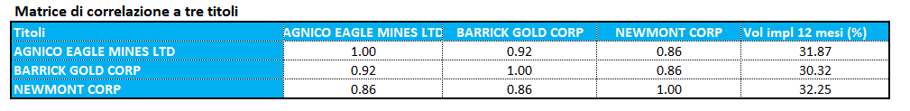 Sotto mostriamo la tabella di correlazione e volatilità dei tre titoli. La correlazione è molto alta, questo è un aspetto positivo perché significa che i titoli si muoveranno tendenzialmente insieme. Sarà meno probabile che uno dei tre titoli ad un certo punto prenda una strada diversa dagli altri inficiando a scadenza la performance del certificato. Un basket correlato presenta un rischio minore ma implica anche un premio tendenzialmente minore poiché il basket costa di più in fase di strutturazione (minor rischio, minor rendimento) all’emittente. Le volatilità dei tre titoli non sono altissime collocandosi intorno al 30%.