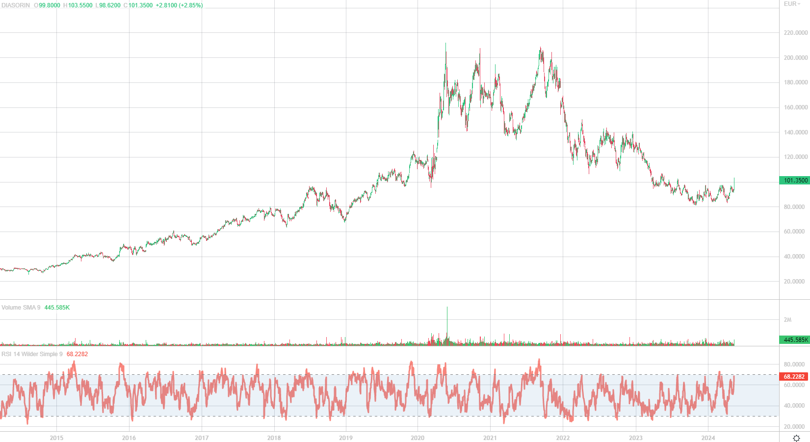 Diasorin è una storia un po’ particolare. Il titolo ha accusato il colpo della discesa dei ricavi covid più velocemente del previsto (2022 e 2023). Il management però ora è abbastanza positivo e si aspetta che alcuni progetti sulla diagnostica molecolare, quella a maggiore crescita per il posizionamento strategico, possano entrare a fine 2024, così come quelli sull’immuno diagnostica, apportando un contributo importante sul fatturato. In particolare, il Liaison Plex (diagnostica molecolare) sarà commercializzato da giugno e consente diagnosi personalizzate selezionando i patogeni che si desira investigare, con minore spesa e maggiore efficienza. Interviene in un mercato che nel mondo vale 2,9 miliardi ed atteso in crescita fino a 4 miliardi entro il 2027. Il QuantiFeron (immunodiagnostica), ovvero il test per la diagnosi della individuazione della tubercolosi latente, realizzato con Qiagen, ha di recente annunciato ottimi risultati di vendita per un mercato assai vasto. Sul Liaison Nes, Diasorin è pronta per il lancio a marzo dell’anno prossimo. Infine per il LIAISON MeMed (immunodiagnostica), test per distinguere tra infezioni batteriche e virali, Diasorin sta cercando di convincere gli ospedali a usare questo test che potrebbe far risparmiare un sacco di costi alla sanità (come il problema dei casi di cattiva prescrizione degli antibiotici). Inoltre, nel caso di una effettiva normalizzazione dei tassi di interesse di mercato nel 2H, il titolo Diasorin sembra ben posizionato per un significativo re-rating, considerando anche la sua natura di long duration asset. C’è anche appeal speculativo sul titolo: Il 50% del mercato è controllato da cinque società ed il resto è frammentato sulle piccole, compresa Diasorin che ha circa 1% mercato. Possibile anche un consolidamento nel settore che possa coinvolgere Diasorin.