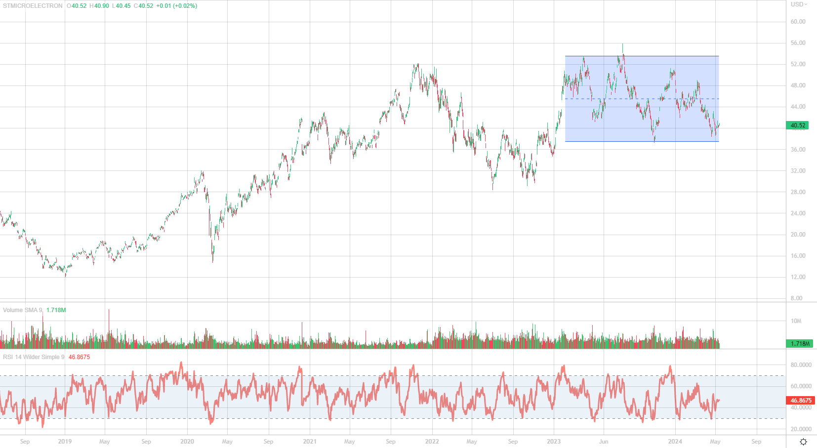 STM dopo aver toccato nuovi massimi a luglio 2023, ha avviato una fase laterale che in realtà parte ben prima, ovvero da inizio 2023. Il titolo infatti ha alternato periodo positivi a meno positivi. Per tutta la prima parte 2023 abbiamo assistito ad un andamento positivo delle stime ma, nonostante ciò, le quotazioni non riuscivano a decollare, perché gli investitori non si fidavano a comprare gli ultimi rialzi stime. Questo perché non apparivano sostenibili. Il mercato di riferimento veniva da una situazione di shortage di semiconduttori (periodo covid) e nel giro di un anno e mezzo la forte domanda aveva spinto tutti i produttori e distributori ad ordinare più di quanto avessero bisogno, passando così da un severo shortage ad abbondanza di chip. Una dinamica dovuta anche al fatto che si è passati da tempi di consegna molto lunghi (diversi mesi), a tempi più stretti. Con il calo della domanda in seguito al rallentamento economico, non c’era più questa necessità di ordinare troppo. Inizialmente abbiamo assistito allo storno importante nell’elettronica di consumo cominciata nella seconda metà del 2022 che ha colpito ovviamente società come STM molto esposte a questo comparto. Recentemente però questo mercato sembra essere uscito dalla crisi, con dati positivi fatti registrare dalla fine del 2023 e nel primo trimestre 2024. Ora però, quello che è successo al mercato dell’elettronica, STM lo sta subendo sul mercato industriale. Ci riferiamo alle automazioni delle fabbriche, alla produzione di strumenti per chi lavora, e alle energie rinnovabili, insomma, tutto ciò che non è auto o elettronica di consumo. Il management di STM ha detto che il periodo di riduzione scorte sarà lungo e durerà per molto tempo. Il 2024 potrebbe chiudere male su questo settore che pesa il 30% del suo fatturato. Quindi, l’elettronica di consumo sembra rialzare la testa e ripartire, dopo aver subito un calo forte. Il mercato industriale invece è nel pieno delle difficoltà, ma il titolo STM sembrerebbe aver già incorporato il suo calo. Rimane da capire cosa sarà del terzo mercato importante per la blu chip italiana, ovvero il settore auto, che pesa per un 40% del giro d’affari. Qui abbiamo avuto una riduzione delle attese di crescita ma non siamo in una fase di profonda correzione ed ora questa è la paura del mercato e la ragione della lateralità del titolo. Il mercato è in attesa di capire come si muoverà il comparto dell’auto. Detto questo, va sottolineato che STM tratta ad una valutazione bassa rispetto all’industria e alla sua storia: 12/13 volte l’utile che rimane una valutazione interessante. Ricordiamo inoltre che la società è inserita in un trend secolare di crescita, quindi, a meno che non si pensi che l’elettronica sia in crisi profonda, il titolo ora è su un buon livello.