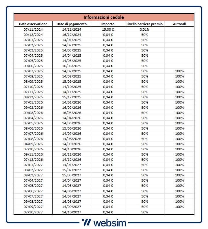 Come dicevamo, successivamente al pagamento del cedolone iniziale, il certificato pagherà cedole mensili con memoria dello 0,34% (pari a poco più del 4% annuo). La barriera per il pagamento dei premi mensili è profonda al 50% dei valori iniziali (strike), stesso livello che sarà poi osservato a scadenza per il rimborso del valore nominale a scadenza. In tal senso, l'investitore continuerà ad incassare i premi fin tanto che nessuno dei tre titoli del basket sia sceso di oltre il 50% dai rispettivi strike iniziali.