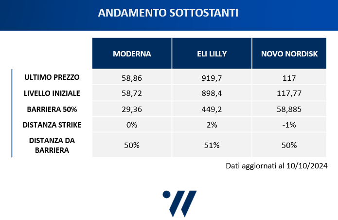 Ma il certificato di oggi è interessante non solo per la sua maxi cedola del 15%, ma anche perché investe su un tris di titoli che permette di diversificare rispetto ai soliti basket su blue chip italiane. Un basket composto da tre veri e proprio colossi del comparto farmaceutico dal calibro di Moderna, Eli Lilly e Novo Nordisk.