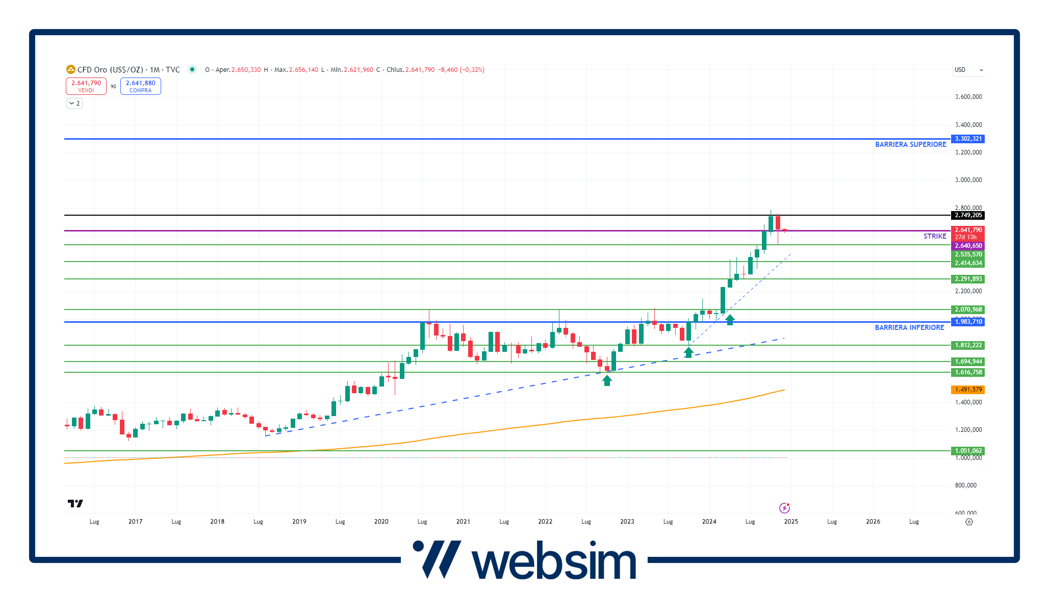 Come vediamo dal grafico qui sotto, la barriera superiore (al 125% dello strike: 2.640,6 dollari/oncia) si trova poco sopra a 3.300 dollari/oncia, mentre quella inferiore (ovvero posta al 75% del livello di riferimento iniziale) è poco sotto il livello spartiacque dei 2.000 dollari/oncia. Sulle barriere è importante ricordare che sono di tipo europeo e quindi l'osservazione è solo a scadenza.