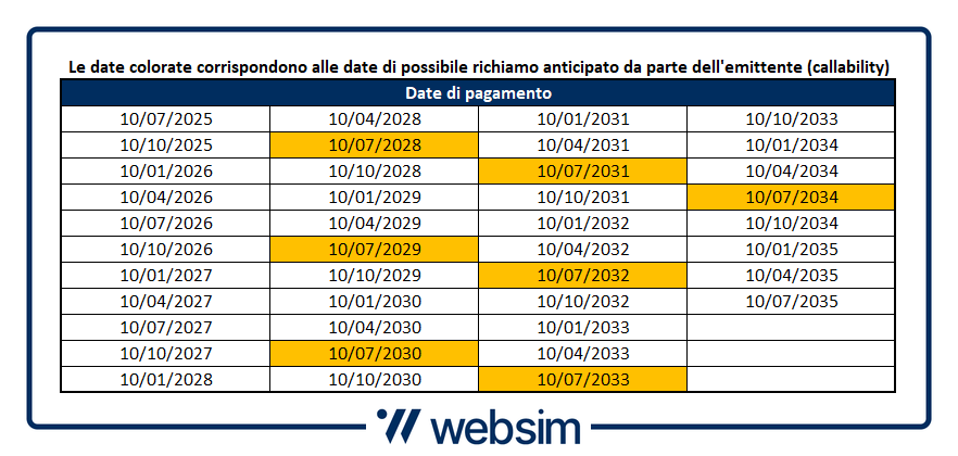 Come abbiamo detto poi, il prodotto può essere richiamato a discrezione dell’emittente (callable) dal 10/07/2028, con cadenza annua. In tal caso verrebbe pagato l’ultimo premio e rimborsato il 100% del nominale. La struttura permette dunque di bloccare un rendimento interessante per almeno tre anni.