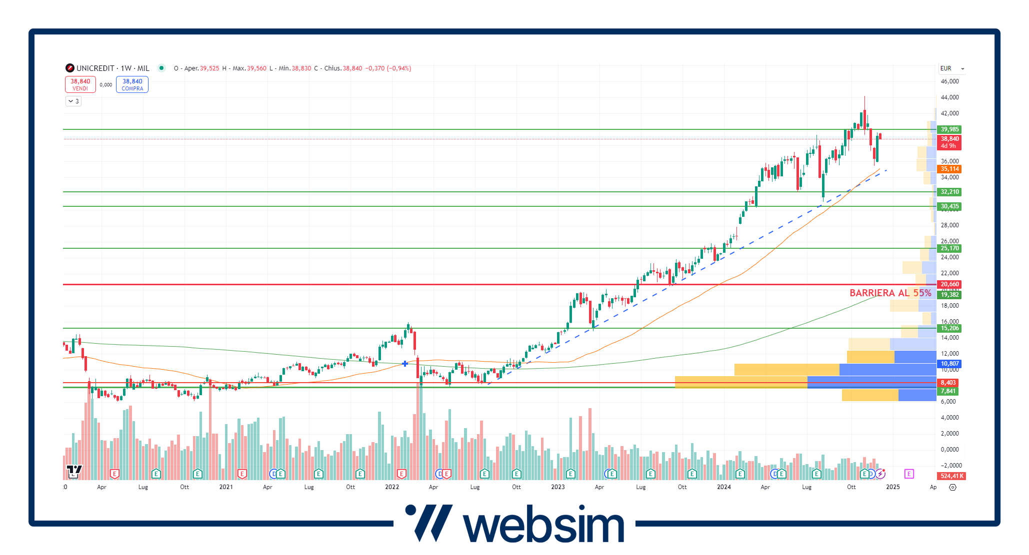UniCredit ha fissato il suo prezzo strike a 37,565 euro con la barriera di protezione al 55% che è dunque situata a quota a 20,66 euro, prezzi di settembre 2023. I principali supporti statici per UniCredit sono a 35 € - 30 € e 25 €.