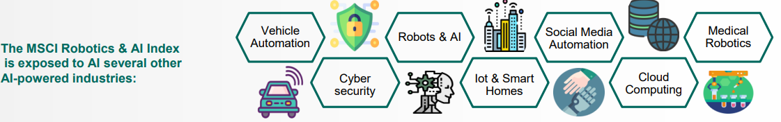 L'universo d'investimento è costituito da un agglomerato di titoli statunitensi di società con un'elevata esposizione all'intelligenza artificiale, alla robotica e all'automazione. I titoli devono avere un valore medio giornaliero di scambi negli ultimi 3 mesi superiore o uguale a 5 milioni di dollari USA. I titoli con un minimo del 25% di esposizione tematica vengono selezionati e ponderati in base alla loro rilevanza e capitalizzazione di mercato, senza eccedere mail il 5% ciascuno. L’indice è quindi ben diversificato.