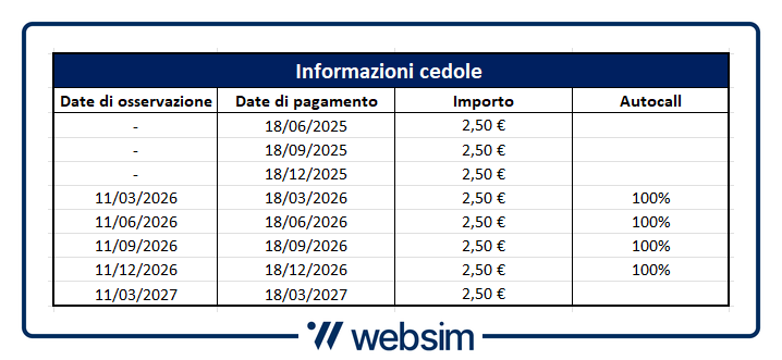 Nella tabella qui sotto possiamo vedere le date di osservazione dell'Autocall e le date di pagamento delle cedole trimestrali da 2,5 euro (valore nominale 100 e denominazione in euro visto l'"effetto Quanto" per sterilizzare il rischio cambio).