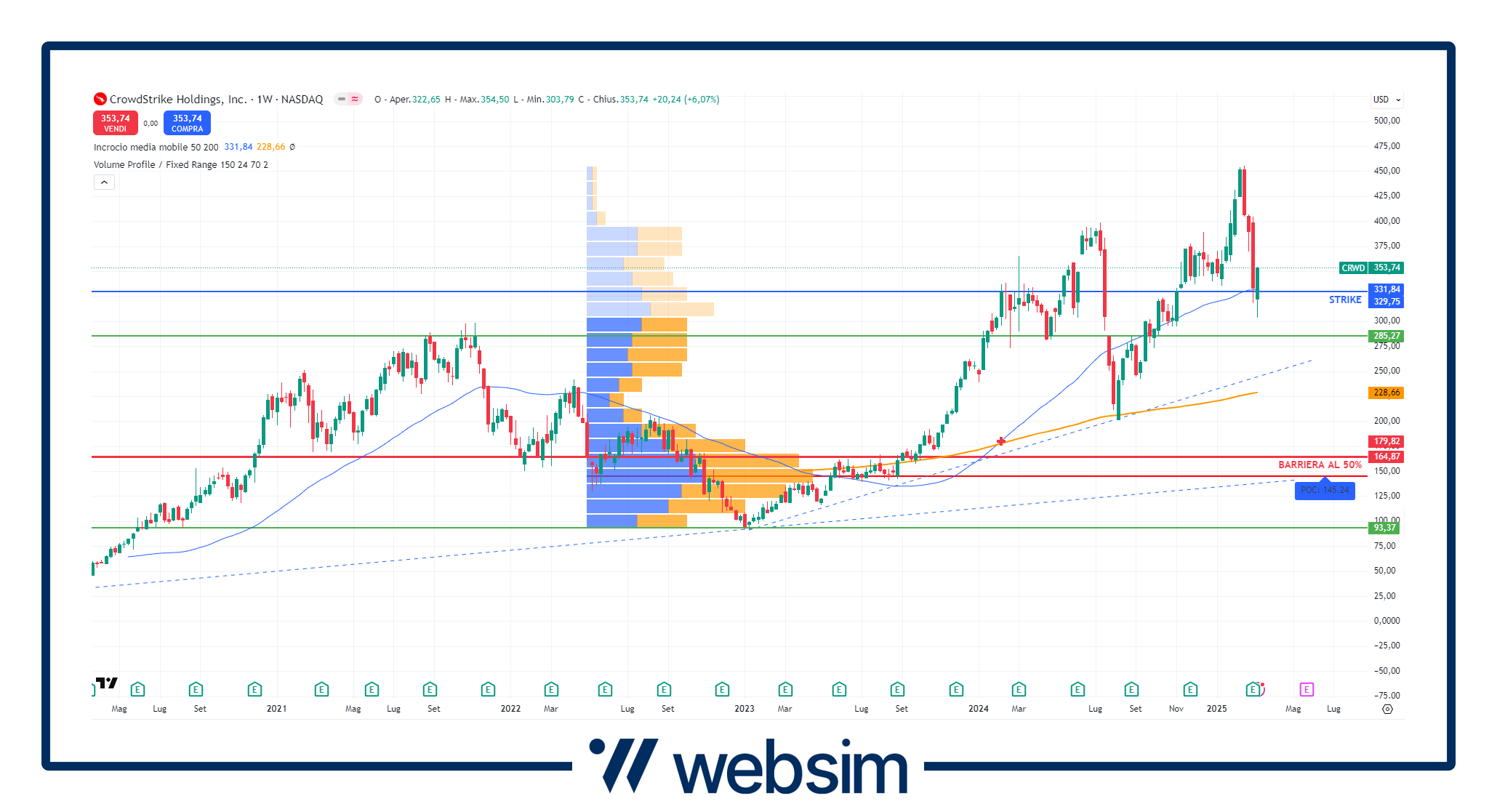 Nel grafico è rappresentato l'andamento su time frame settimanale di CrowdStrike. Prezzi strike fissati dopo la recente correzione a 329,75 dollari, un livello iniziale che permette al certificato ISIN DE000VG66VH0 di avere per CrowdStrike una barriera a scadenza a quota 164 $.