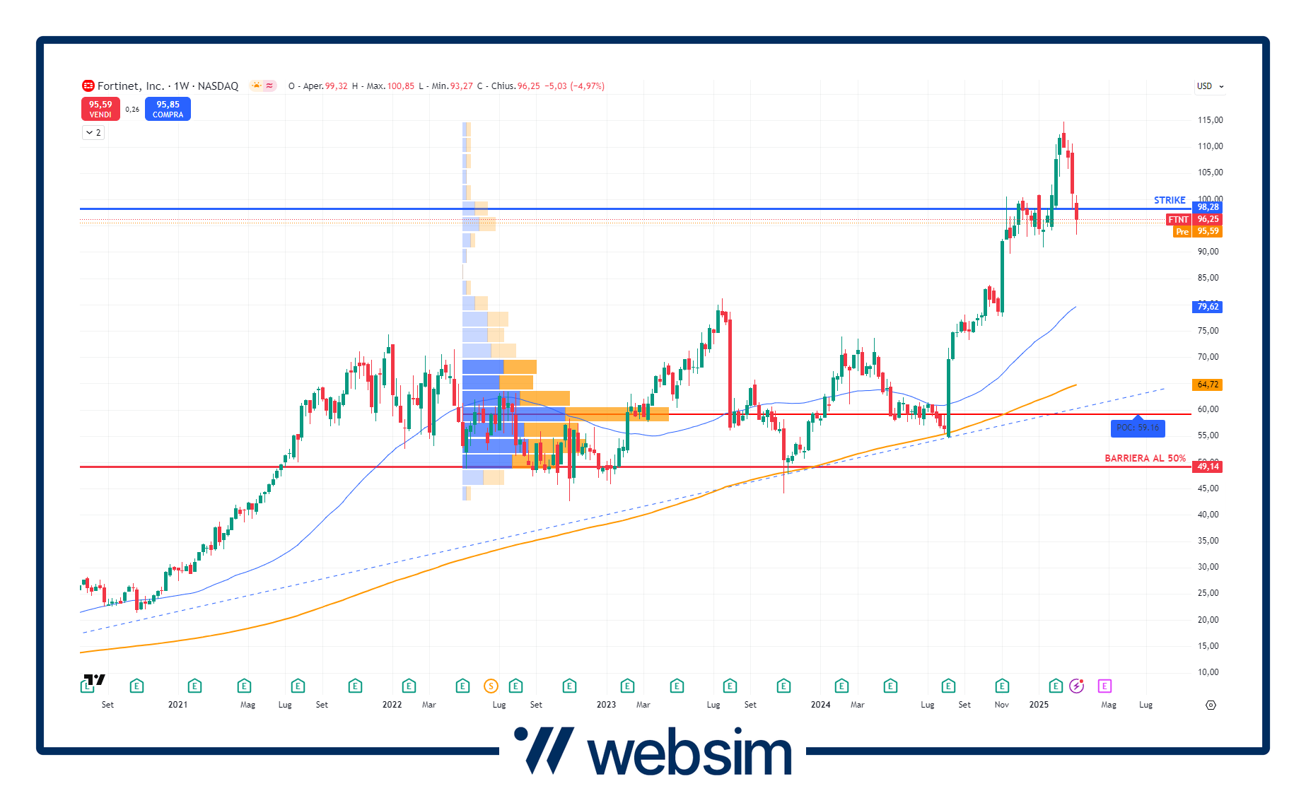 Nel grafico è rappresentato l'andamento su time frame settimanale di Fortinet. Il suo prezzo di riferimento iniziale è rappresentato dalla linea blu e si trova a 98,28 dollari, con la barriera a scadenza al 50% che cade così poco sotto a 50 dollari ad azione.