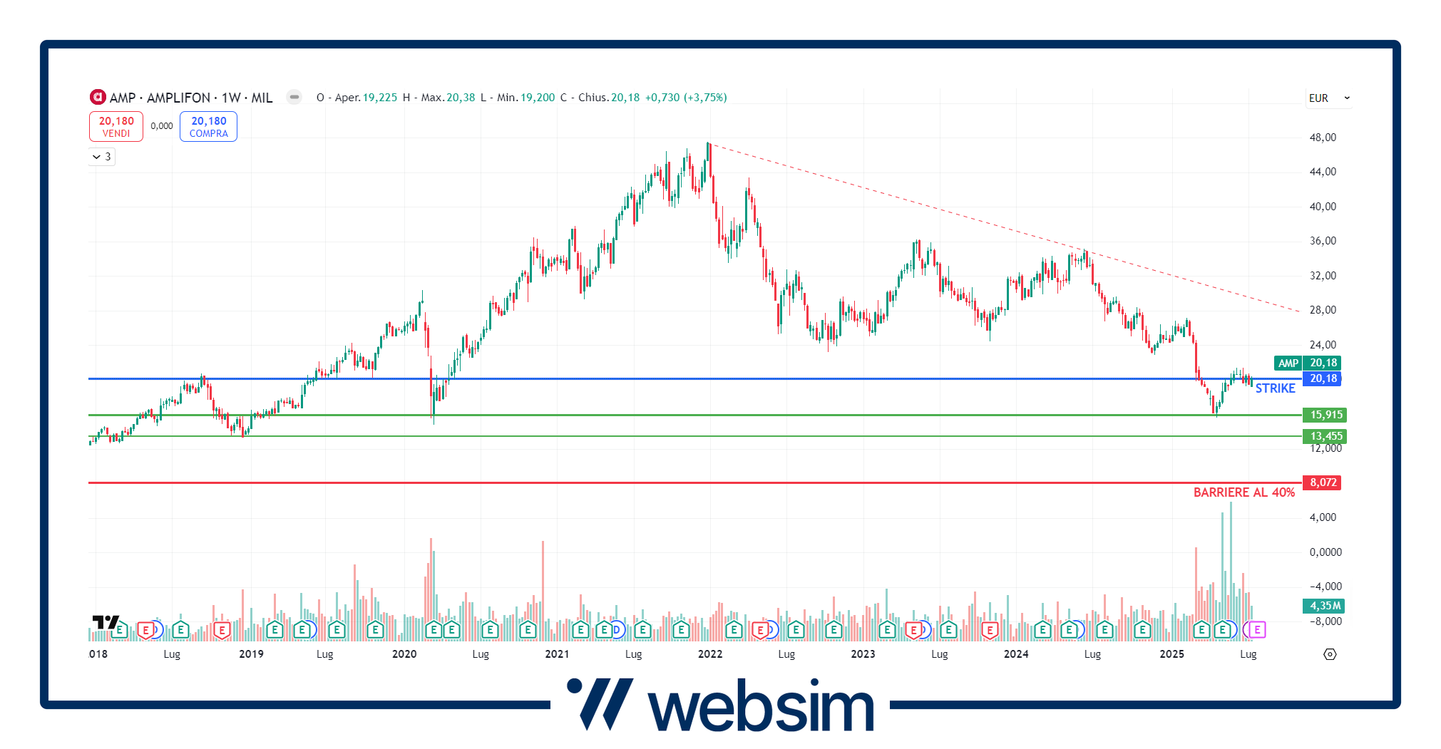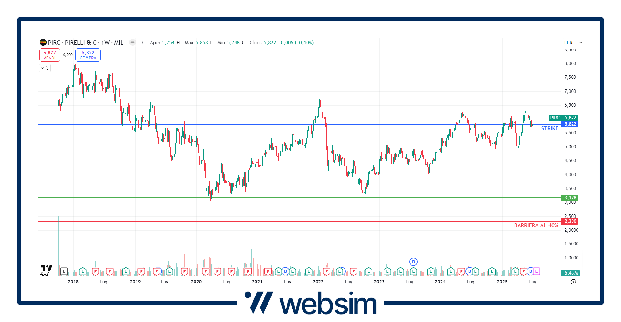 All'interno del certificato ISIN XS3068020547, Pirelli ha fissato il suo prezzo iniziale a 5,822 euro. La barriera protettiva al 40% va dunque a cadere a quota 2,33 euro, livelli mai raggiunti dal titolo. Questo è ben visibile dal grafico sotto su time frame settimanale, dove vediamo lo strike rappresentato dalla linea blu e la barriera con una rossa.