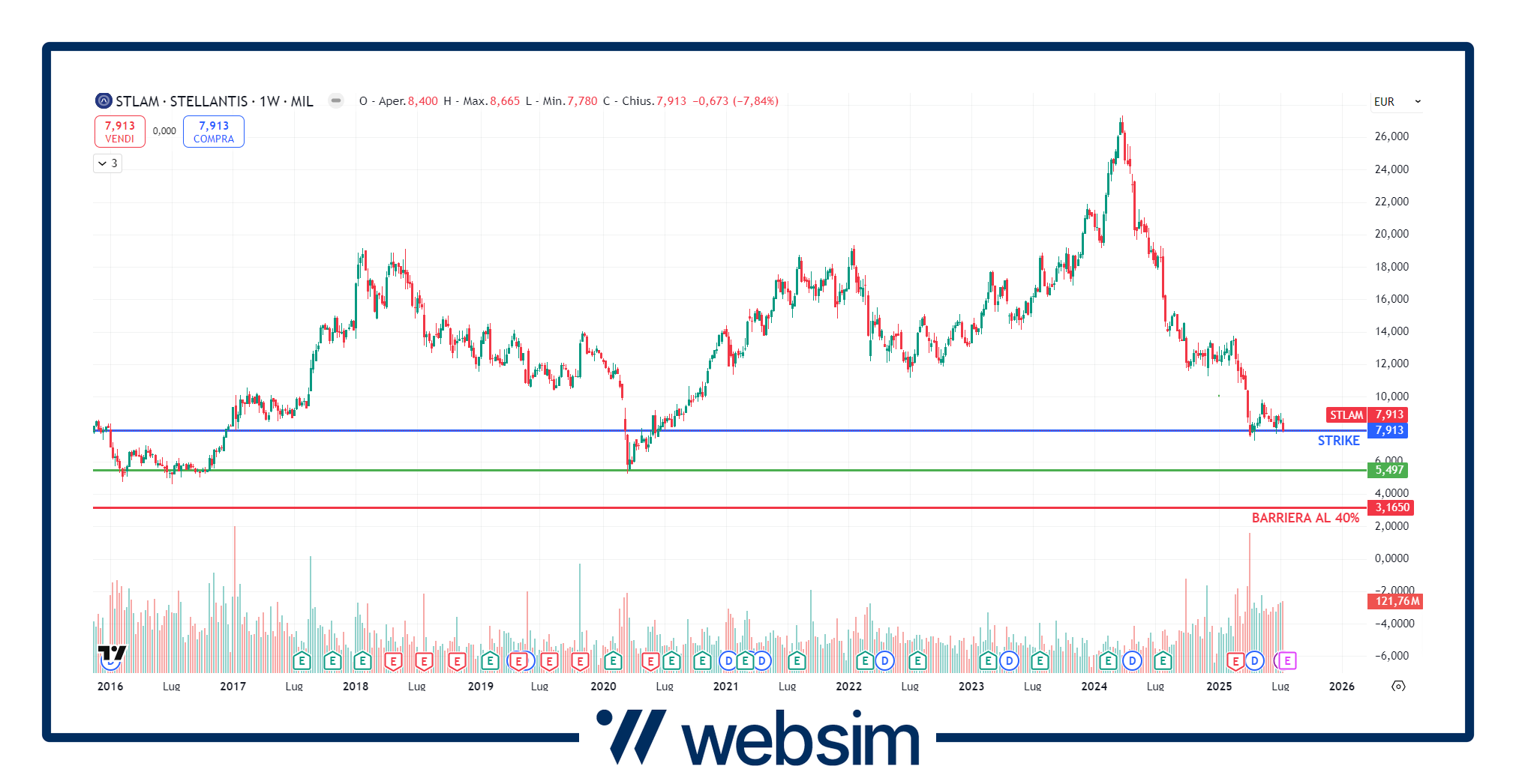 Situazione complessa anche per l'ultimo titolo del paniere: Stellantis. Il colosso dell'automotive dai massimi di marzo 2024 ha perso oltre il 70% e attualmente sta tentando un consolidamento di quota 8 euro. I principali supporti statici sul titolo si trovano ora poco sopra a 5 euro. Lo strike per Stellantis è stato fissato a 7,91 euro, con la barriera al 40% che va a a 3,13 euro, prezzi molto profondi dai livelli attuali e sui minimi del 2013.